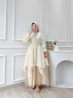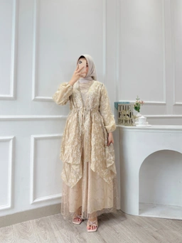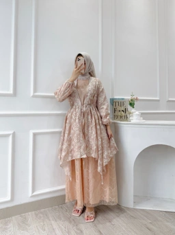 Bahan brokat lace mix furing hyget, tipe bahan jatuh ya.. details inner sleting belakang.. Outer bahan tencel yaa.. ada tali serut bagian depan, tangan berkaret.. motifnya cantikk bgt!🤍