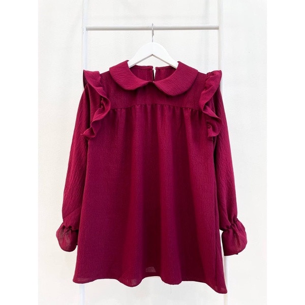 AYANA BLOUSE Bahan Kringkle premium ✨ Cakep bangetttz 👌👌 All size : Lingkar Dada 110 Panjang Baju 68cm Panjang Lengan 54cm Lingkar lengan 52cm Varian warna : Maroon-Taupe-Matcha-Mustard-Bluedenim-Guava-Black Berat produk : 300gr • tidak 100% sama dikarnakan perbedaan cahaya yang di hasilkan oleh kamera -Details pada bagian bahu terdapat ruffle sampai ke belakang baju -Kerah kupu2 lucu banget😍 -Ujung lengan berbentuk lonceng - Bahan enak banget di pakai,lembut & ga panas Cakep bangettt simple tapi elegan 😱🥰 Model baju yg lagi kekinian